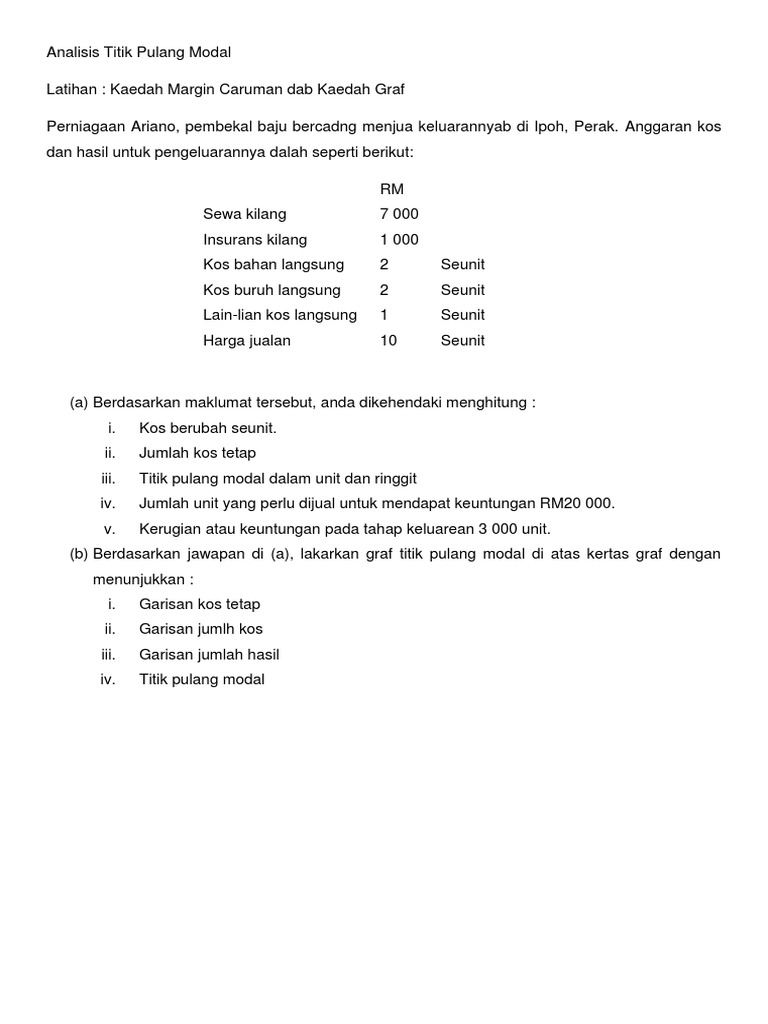 Rumus Titik Pulang Modal a ii. Margin caruman atau margin sumbangan ialah. Kos tetapnya ialah RM 2 juta dan kos berubah ialah RM180 per unit.